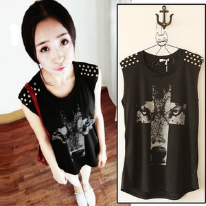 Hot Women Punk Rivets Wolf Cross Printed Sleeveless Tank Vest Top T-Shirt Blouse. Fashion Girls Women Tank Top Sleeveless Tee Stretch Vest Tops SG1070.